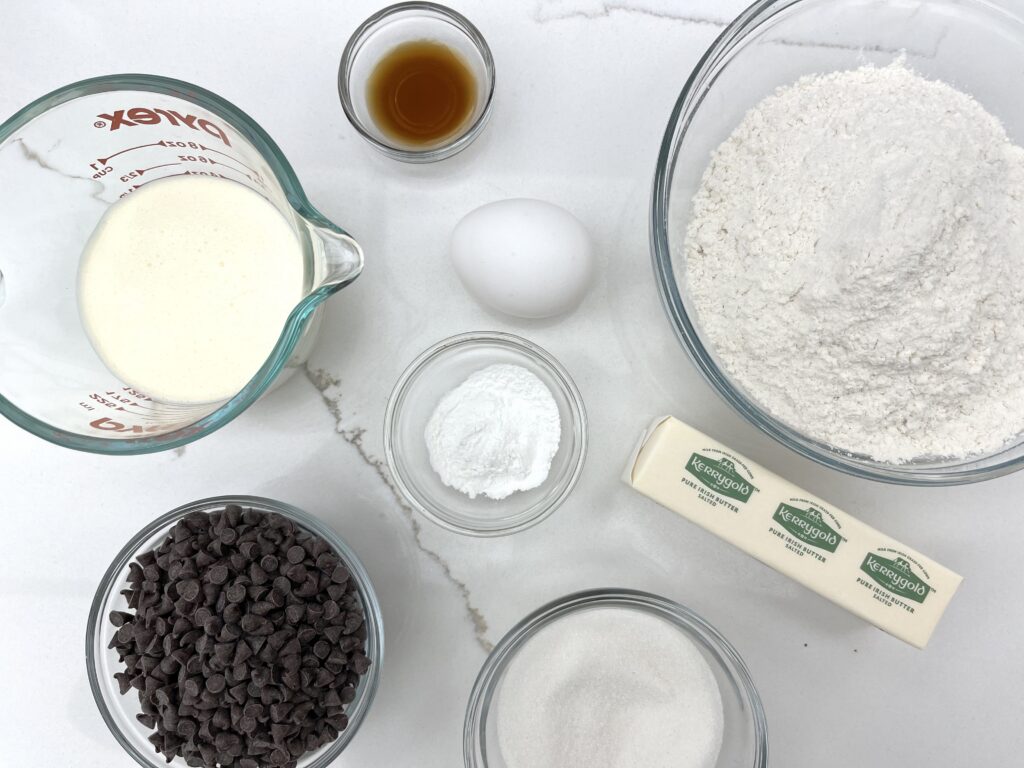 These chocolate chip scones are the perfect balance of crisp, golden edges and a tender, buttery center with chocolate studded throughout. We like using mini chips for more chocolate in each bite! The key to great scones is cold ingredients, minimal mixing, and chilling the dough before baking to help them hold their shape in the oven.
