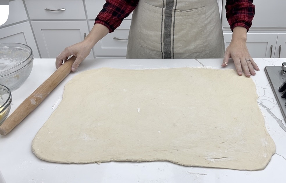 10. Generously flour your workspace, the rolling pin and the top of the dough. Roll the dough out into a large rectangle, about 30 x 12 inches, using more flour as needed.