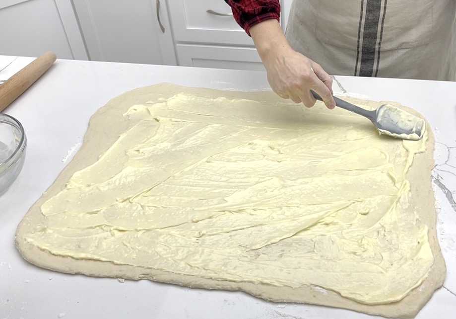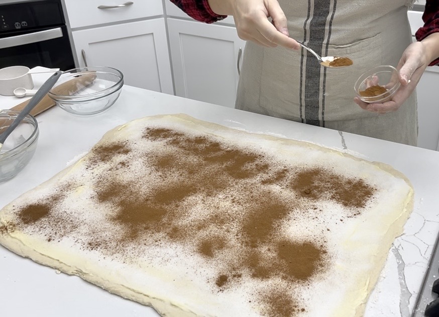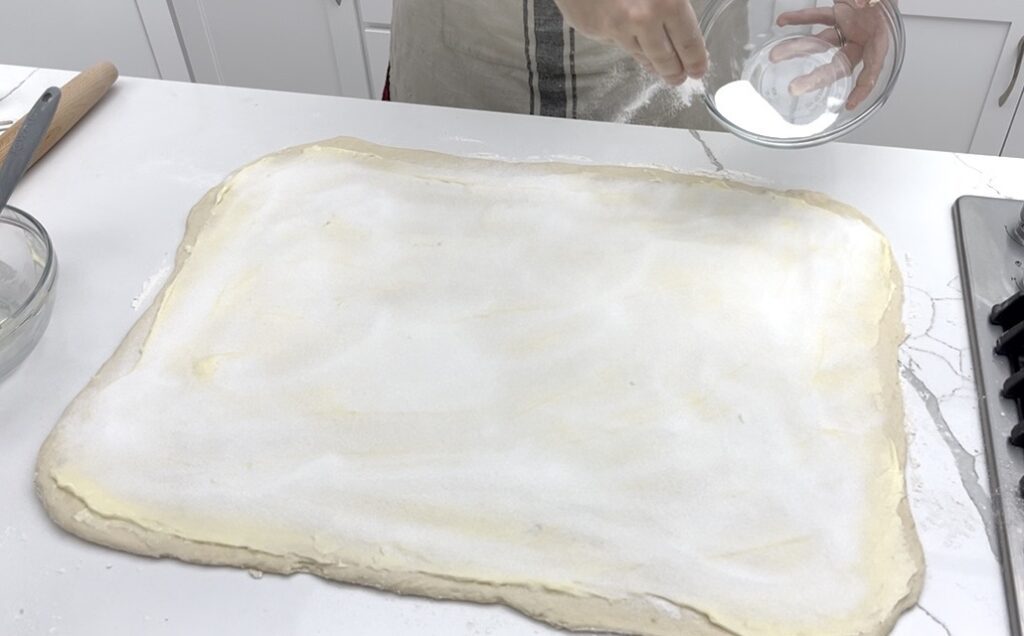 11. Spread the softened butter evenly on the dough, going all the way to the edges. Evenly sprinkle the sugar on top of the butter, and then the cinnamon.