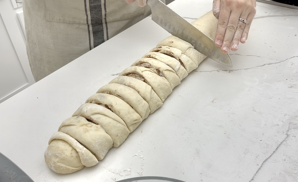 13. Using a sharp knife, cut the log into 24 rolls and place on the prepared baking sheet.