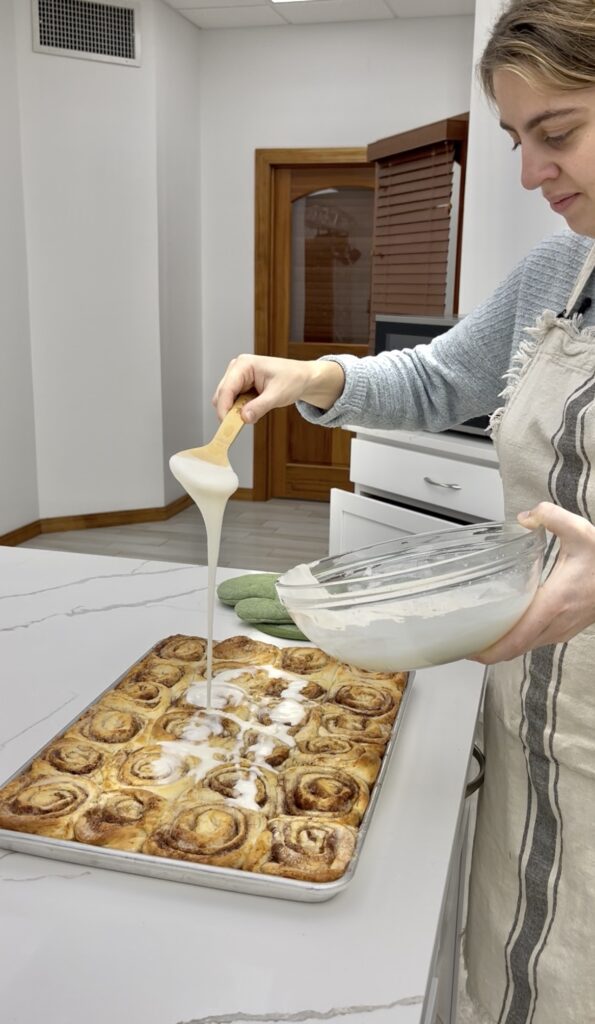 17. When the rolls are finished baking, remove them from the oven and allow to cool for a few minutes before spreading the icing on top. Enjoy!