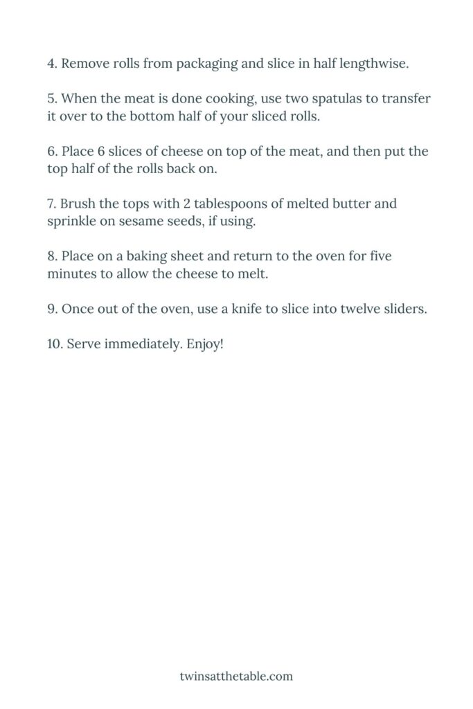 This recipe is so quick and easy and is perfect for sharing. PLUS it is 100% kid and grown up approved! Soft rolls, melted cheese, juicy beef… what’s not to love?